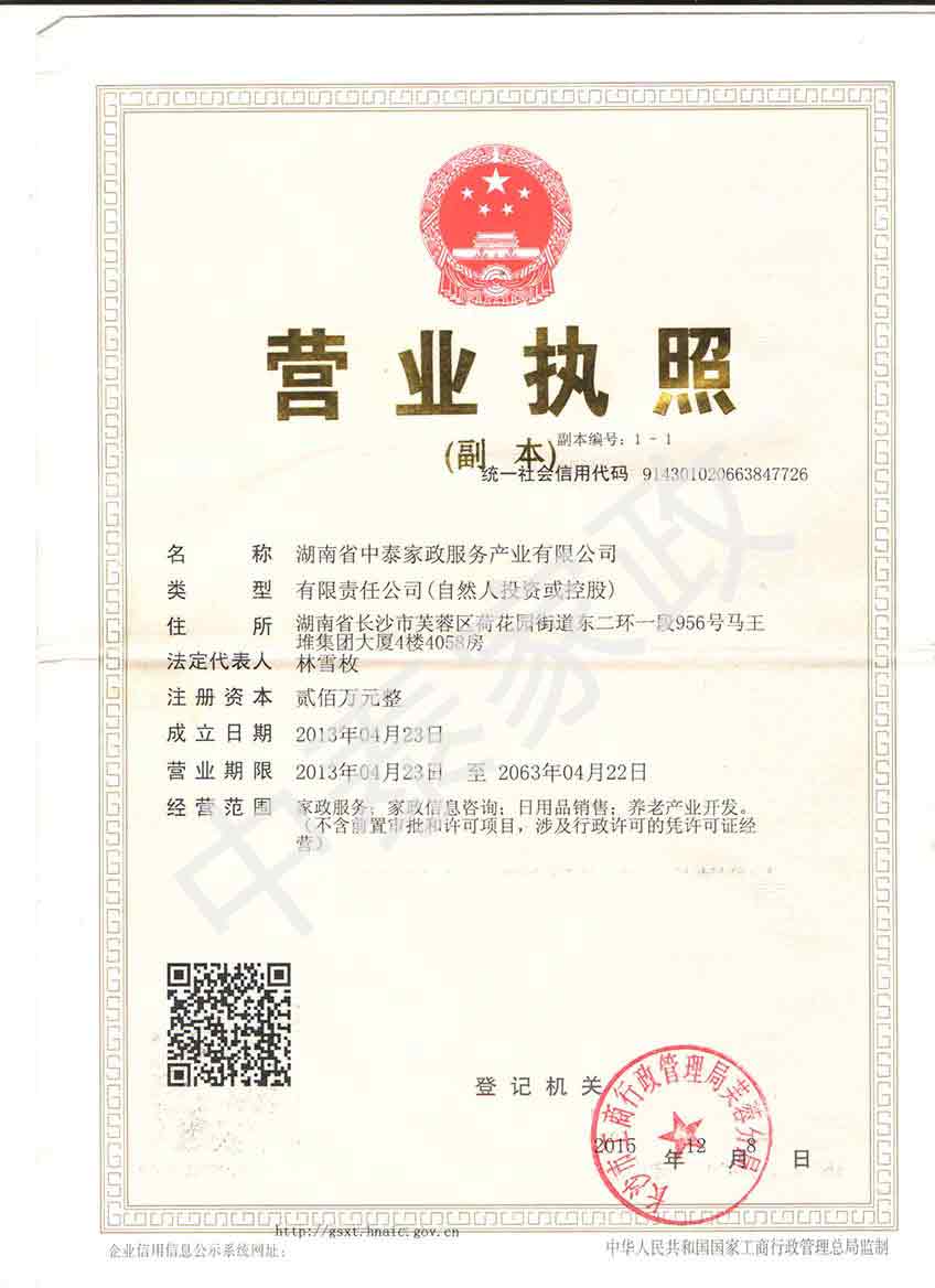 湖南省中泰家政服务产业有限公司是专业从事家庭服务业,集保姆、月嫂、育婴师、催乳师;老人陪护、病人护理;家庭保洁、楼宇保洁、水电安装、家装维修、管道疏通、产品配送及各项开荒保洁类服务为一体的服务机构。目前,总部设在湖南省会城市——千年古城长沙,地处"千年富贵地,盛誉马王堆"盛誉的马王堆中心以南地段,在长沙地区设有多个分支机构,具有自己广阔的网络资源,从单位成立零起步发展至今已拥有各类专业服务人员两万多人。现为是湖南省家协常务理事单位、长沙市家协第二届副会长单位。